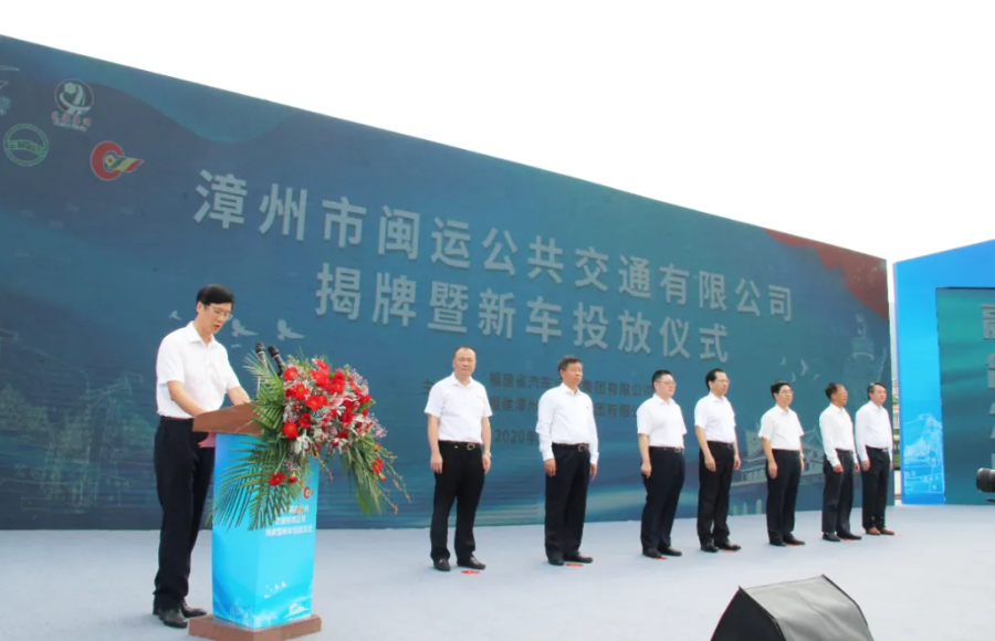 漳州市長劉遠,福建港口集團黨委書記、董事長李興湖共同為漳州市閩運公共交通有限公司揭牌。